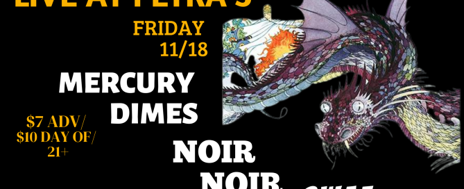 Friday, November 18 Doors: 8pm | Show: 9pm Tickets: $7 Advance | $10 Day Of • 21+ with valid ID Mercury Dimes Dynamic rock band with hints of indie, punk, and folk hailing from not-quite-Charlotte, NC. linktr.ee/mercurydimes Noir Noir: Soul Gaze @noir_noirband/ SWAE https://open.spotify.com/track/32dYWJtA8didXZU2FuoALW