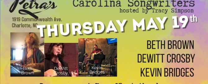 Thursday, May 19th Doors: 7pm | Show: 8pm Tickets: $5 at the door • 21+ with valid ID, face masks encouraged Carolina Songwriters in the round featuring: Kevin Bridges Beth Brown DeWitt Crosby Hosted by Tracy Simpson