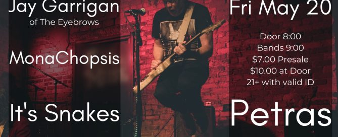 Friday, May 20th Doors: 8pm | Show: 9pm Tickets: $7 Advance | $10 Day Of • 21+ with valid ID Jay Garrigan of The Eyebrows www.the-eyebrows.com Monachopsis https://www.youtube.com/channel/UC1OLVLJznql86pDuvDXn-HA It's Snakes https://www.facebook.com/itssnakes/
